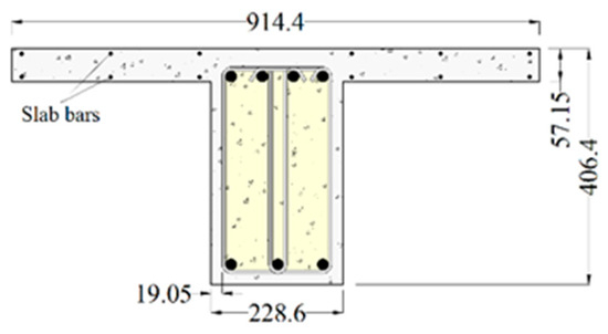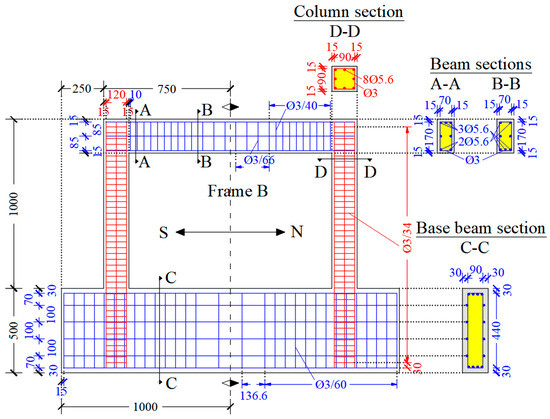 Kakaletsis and Karayannis [18]—Geometry and reinforcement details of Frame B. Dimensions in (mm).