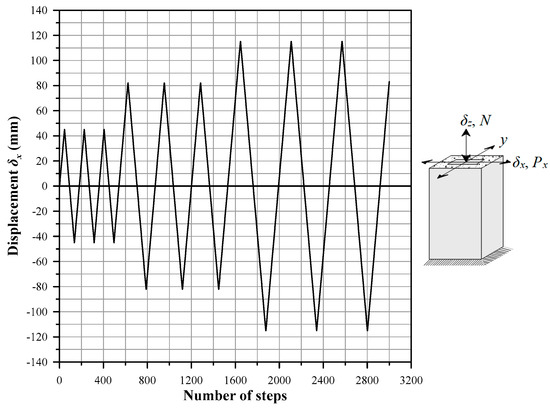 Specimen S0 was subjected to uniaxial cyclic loading in x direction, applying the displacement path seen in Figure 2. This path has three successive displacement patterns with their maximum values occurring in increasing order. Each one consists of cyclic displacements with initially increasing values that then decrease.