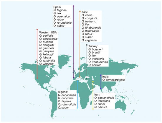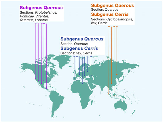 Distribution of oak trees worldwide by subgenus and sections. Source: own elaboration based on Denk et al. [19].
