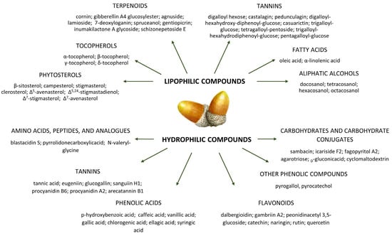 Acorns contain high levels of bioactive phenolic compounds, including phenolic acids, flavonoids, and tannins. Nevertheless, recent scientific reports have revealed numerous other compounds with biological activity, both hydrophilic and lipophilic compounds (Figure 5).