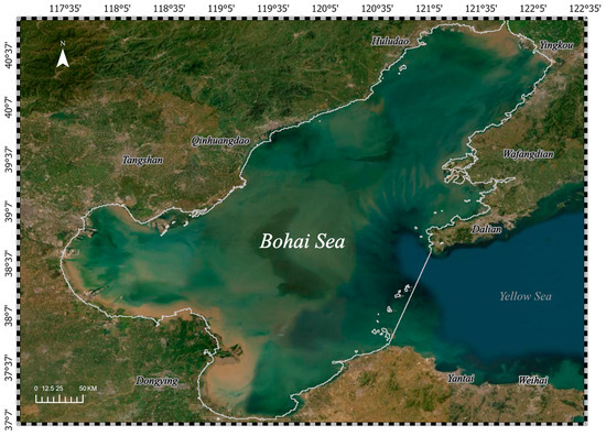 A satellite remote sensing image of the study area in the Bohai Sea region.