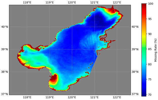 A mask extraction task was first performed on each full-frame Level-2A chl-a image to generate the 2019 chl-a dataset for the Bohai Sea region. The downloaded dataset comprised 2764 images, with a resolution of 808 × 842 pixels per image and a total of 300,364 marine pixels (land pixels had already been excluded). The overall missing rate (OMR) of the dataset is 79.09%. Temporally, the spatial missing rate (SMR) of each chl-a image ranges from 6.87% to 100%. Notably, 1531 of these images have an SMR over 95%, accounting for 54.8% of the entire dataset. Spatially, the temporal missing rate (TMR) at each pixel varies from 69.36% to 100%. Among these, 20,417 pixels exhibit a TMR higher than 95%, representing 6.80% of the marine pixels. These pixels are predominantly located in nearshore shallow-water areas, as shown in Figure 2.