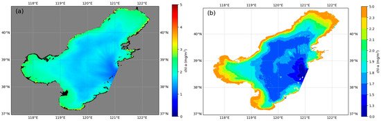 Spatial distribution of average chl-a concentration in the Bohai Sea in 2019. (a) A stretch color map of chl-a concentration with a blue to red color ramp, in which blue indicates low concentration and red represents high concentration; (b) a graduated map divided into 10 levels with different intervals.