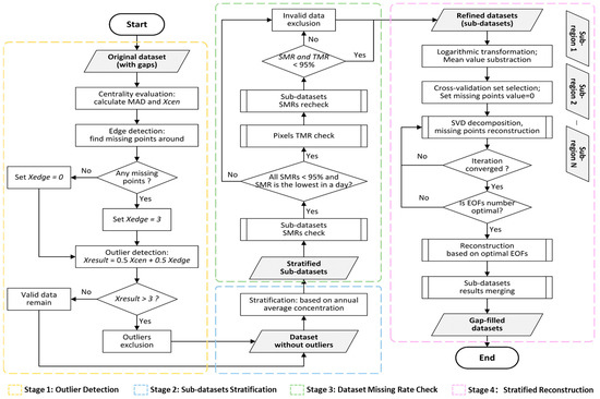 Given that the EOF-based reconstruction algorithm has certain limitations on the original data, images with an SMR over 95% or pixels with a TMR over 95% are unable to provide adequate information in the spatiotemporal matrix, thus affecting the reconstruction performance [37]. Therefore, further analysis and exclusion of these highly missing images and pixels are required. The methods for checking and processing these data will be detailed in Section 2.3.2.