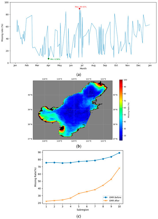 Statistics of data missing from 2019 chl-a refined dataset of Bohai Sea region. (a) SMR of each chl-a image in the refined dataset. (b) Spatial distribution of TMR for each pixel point in the refined dataset. (c) Comparison of OMR for each sub-dataset before and after missing-data checks.