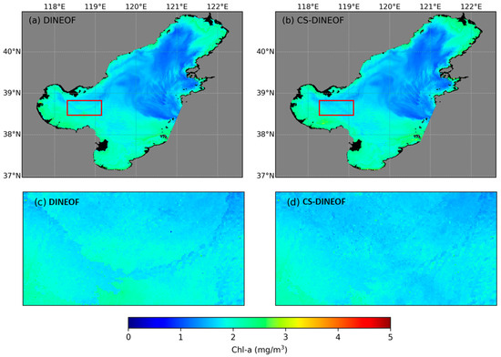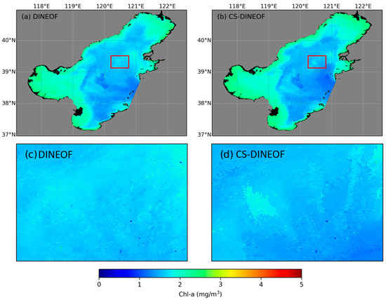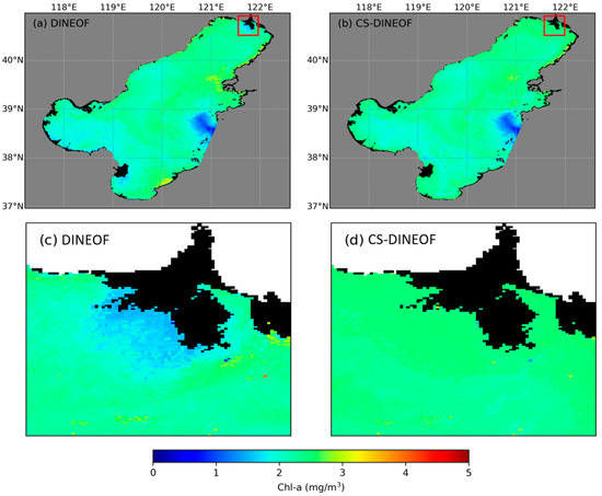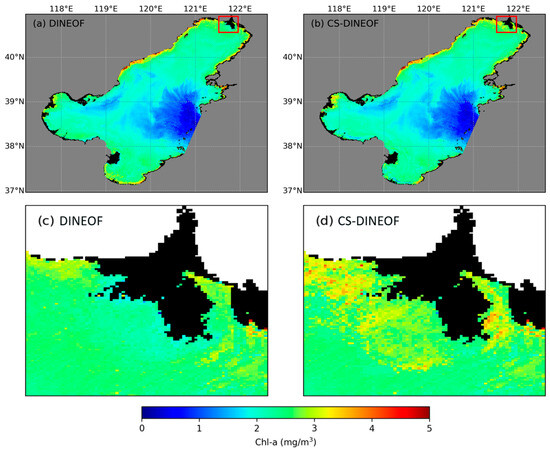Figure 6 presents four examples of chl-a images with gaps (indicated by black spaces) on 15 February, 26 April, 22 September, and November 28 in 2019, covering four days from different seasons, with SMRs of 78.47%, 31.66%, 18.98%, and 53.46%, respectively. Figure 7, Figure 8, Figure 9 and Figure 10 show the reconstructed results using the DINEOF and CS-DINEOF methods, along with zoomed-in views of local details. As shown in Figure 7a,b, Figure 8a,b, Figure 9a,b and Figure 10a,b for data from different seasons with varying missing rates, both DINEOF and CS-DINEOF methods could fill the gaps in chl-a images with reasonable values and thus capture the comprehensive distribution of chl-a in the Bohai Sea region (except for the invalid points in coastal areas where the missing-data rate exceeds acceptable limits).