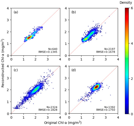Density scatterplots of original and reconstructed chl-a values by the CS-DINEOF method at cross-validation points on (a) 15 February, (b) 26 April, (c) 22 September, and (d) 28 November in 2019.