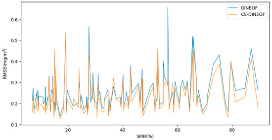 To further investigate the optimization effect of the CS-DINEOF method under different missing conditions, the SMR and the RMSE between the original and reconstructed values at cross-validation points were calculated for each image in the dataset. As shown in Figure 12, although the RMSE trends of both the CS-DINEOF and ordinary DINEOF methods were similar across different SMRs, the CS-DINEOF method consistently obtained lower reconstruction errors in almost all cases, with an average reduction of 0.0281 mg/m3. Hence, it is evident that the CS-DINEOF method can achieve superior reconstruction performance over the DINEOF method under different missing conditions.