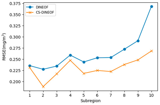 In proposing the improvement approach of CS-DINEOF, we assumed that data within subregions stratified based on annual average concentration would have similar spatiotemporal patterns. Based on this assumption, stratified reconstruction was performed, resulting in improved accuracy and efficiency compared to the ordinary DINEOF method. To assess the performance of the proposed algorithm across different sub-datasets, we carried out a stratified comparison of reconstruction results, calculating the RMSE for each sub-dataset reconstructed by both DINEOF and CS-DINEOF methods. The results, as shown in Figure 13, demonstrate that the stratified reconstruction strategy of CS-DINEOF improved the accuracy in each sub-dataset. Notably, the most substantial improvement was observed in subregion 10, suggesting that the CS-DINEOF method is more effective than DINEOF in reconstructing missing chl-a data in the coastal areas of the Bohai Sea. The reason is that the spatiotemporal patterns of chl-a in coastal areas are different from those in open-sea regions, and the CS-DINEOF method can enhance the stability of spatiotemporal patterns within stratified clusters by independently reconstructing data within each subregion, thereby significantly improving reconstruction accuracy in these regions.