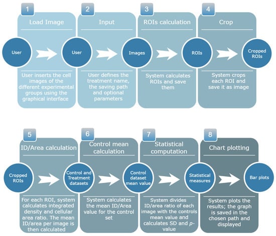 Aware of these limitations, we develop a new open-source workflow that combines automatic IF image quantification with statistical data analysis, providing a simple and user-friendly graphical interface. The signal quantification is based on the automatic pixel analysis to extrapolate only those of interest. Indeed, the calculation of the ROIs is ensured by two successive steps: a first opening operation to eliminate spurious pixels and the second closing operation to join the largest points in the image and include only the specific pixels. Only after that, the algorithm extrapolates the individual ROIs from the initial image. These operations guarantee analytical specificity, as only the pixels of the cellular signals are detected and calculated.