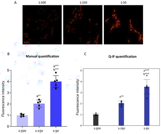 All the results obtained in this study were expressed as mean ± SD (standard deviation). Statistical analysis was conducted upon verification of the Normality assumption by using the Shapiro–Wilk test. The unpaired Student’s t-test was applied to compare the two experimental groups. Conversely, one-way analysis of variance (ANOVA) followed by Tukey’s post hoc test was used to compare the three experimental groups. Values of p and adjusted-p < 0.05 were considered statistically different for the t-test and the Tukey test, respectively. For the manual analysis, statistical analysis was carried out using GraphPad Prism 8 (GraphPad, La Jolla, CA, USA) for Windows 10. On the other hand, statistical analysis and the graphs obtained from the measurements performed by Q-IF were carried out automatically.