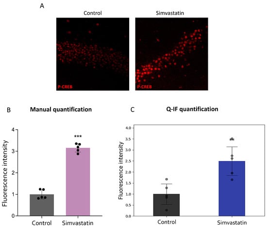 13]. Sections were deparaffinized using xylene and subsequently rehydrated at decreasing concentrations of ethanol. The slides were then boiled in 10 mM sodium citrate buffer (Carlo Erba Reagents S.r.l., Milan, Italy, 479487), pH 6.1, and processed for the antigen-retrieval procedure, using a microwave oven at 360 W for 6 min. After cooling, the blocking of non-specific bonds was performed for 1 h in PBS containing 3% BSA and 0.5% Triton-X 100 (Merck Life Science, Milan, Italy, X100). Subsequently, samples were incubated overnight with anti-P-CREB antibody (Santa Cruz Biotechnology, Dallas, TX, USA, sc-7978, 1:50 dilution) diluted in PBS containing 1.5% BSA and 0.25% Triton-X 100. After 24 h, samples were incubated for 1 h with goat anti-rabbit secondary antibody Alexa Fluor 546 (ThermoFisher Scientific, Waltham, MA, USA, A-11035). Finally, coverslips were mounted with Fluoroshield mounting medium (F6182, Merck Life Science, Milan, Italy).