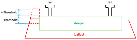 The poor condition of ballast has a significant impact on both traffic safety and travel comfort. The unevenness of the ballast surface is one measure of the condition of the ballast. The algorithm presented in this paper allows us to determine the unevenness of the ballast. According to Polish railway line standards, when ballast unevenness is within +/− threshold = 35 mm, it does not pose a threat to traffic safety. These levels are measured relative to the top surface of the sleepers. Figure 1 presents a cross-section of the track with marked thresholds.