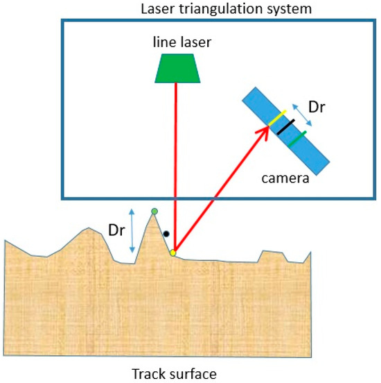 The state of the railway track is monitored using a track inspection vehicle managed by the Polish railway lines—Figure 2. All available data used in our research were collected using this vehicle. One of the several measurement systems installed on the board of the vehicle is a laser triangulation system. It comprises pulsed high-power laser line projectors and synchronized cameras. This system captures a high-resolution intensity image and 3D range profile of the railway track. Laser light is used to illuminate railway surfaces and high-speed cameras are used to capture images of the projected light including its intensity. Figure 3 shows a block diagram of the laser triangulation system. Such a system captures both Intensity and Range images of the railway track simultaneously. Intensity images are produced by mapping the intensity of the reflected laser light, and Range images (depth map), marked in this figure as Dr, are produced by mapping the elevation of each measurement point. The pixels of these two maps correspond one-to-one, that is, the corresponding image regions in the intensity image appear at the same position in the depth map. If a certain target is detected in the intensity map, the corresponding target can be found at the same position in the depth map (Range image).