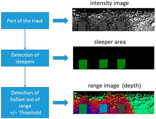Figure 4 shows a block diagram of the ballast unevenness detection algorithm. It is composed of two components. The first component presented in this figure as the “detection of sleepers” box is responsible for the detection of sleepers in the track and is described in Section 2.1. It uses the intensity image coming from the laser triangulation system as an input. Deep neural networks for instance segmentation are used for sleeper detection (both wooden and concrete). The second component presented in this figure as the “detection of ballast out of range +/− Threshold” box specifies the areas of ballast for which its height is outside the defined range of the +/− threshold = 35 mm and is described in Section 2.2. It uses the range image (map) coming from the laser triangulation system as an input and sleeper masks generated by the first component. The width and the height of both the intensity and the range image are equal to 288 and 1024, respectively.