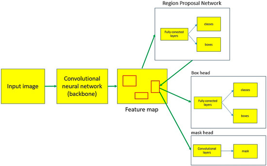 The size of the ROI area generated by the RPN is variable. For this reason, in the next step (part) of the algorithm, the variable ROI size is converted into a fixed size. Here, fully connected layers also occur—box classification layers and box regression layers—which generate the class of the detected object and the coordinates of the bounding box, respectively. Additionally, the ROI is also fed to a fully convolutional network (FCN) [31] to generate the mask of an object being detected. According to [32], the algorithm uses the following objective function during training: