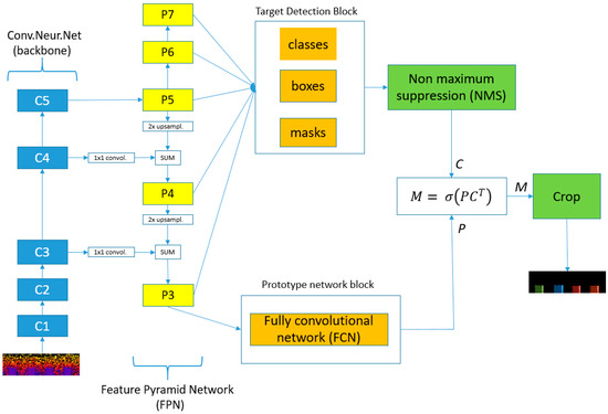 The YOLACT network is a one-stage algorithm used for instance segmentation. The algorithm can be divided into two parallel subtasks, namely a prototype network block and a target detection block. Figure 6 shows a block diagram for the YOLACT algorithm. Both blocks use a convolutional neural network along with a Feature Pyramid Network (FPN) [33]. The FPN adds lateral connections between the P5 and P3 layers of the pyramid. The idea is to take top-down strong features from the C5 layer of the CNN and propagate them to the high-resolution feature maps in the C3 layer of the CNN, thus creating strong features across all levels. The prototype network block generates a set of image-sized “prototype masks”. These masks are independent of the instance. It predicts a set of k prototype masks for the entire image using the FCN. The P3 layer from the Feature Pyramid Network (FPN) is fed to an FCN.