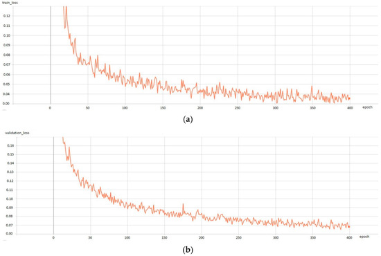 The Mask R-CNN network was implemented using the Keras package in Python. Using the idea of transfer learning, two pre-trained networks were tested. The first uses Resnet51 as the backbone, while the second uses Resnet101. Each of the networks was trained for 400 epochs on a computer equipped with an Intel I5 CPU, NVIDIA GeForce GTX 1080 Ti GPU and 48 GB RAM. We used AdamOptimizer with a learning rate Lr = 0.0001, weight decay w_dec = 0.0005 and momentum = 0.9 to minimize the loss function (loss error) defined by Formula (1). While training, two groups of data were used: train_data for training and valid_data for validation. Figure 7 shows the loss error for the Mask R-CNN with the ResNet101 backbone during the learning process for the train_data set (Figure 7a) and the valid_data set (Figure 7b).