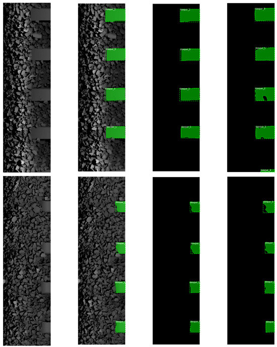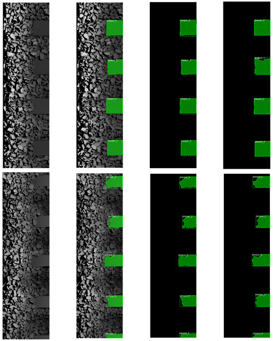 Figure 8 shows examples of detection and segmentation of the sleepers from the intensity images of the track obtained for Mask R-CNN with the Resnet101 backbone. The first column shows the image of the track, the second the image with the predicted bounding box and mask overlaid on it, the third the predicted bounding box and mask and the last the target (truth) bounding box and mask. If we compare the predicted bounding boxes (dashed lines) and predicted masks (green areas) in column three with the corresponding truth bounding boxes (dashed lines) and truth masks (green areas) in column four, we can see negligible differences between them. The exception is the last lower sleeper found in the image from row three. Due to its very small size, it was not detected by the Mask R-CNN network.