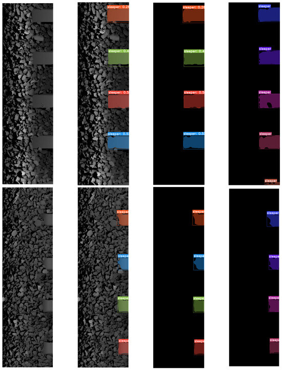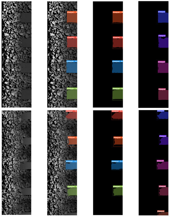Examples of detection and segmentation of sleepers from intensity images of the track obtained for YOLACT with Resnet101 backbone. The first column represents the image of the track, the second the image with the predicted bounding box and mask overlaid on it, the third the predicted bounding box and mask and the fourth the target (truth) bounding box and mask.