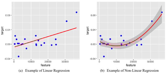 Regression is a type of supervised machine learning. Regression is a method of analyzing the correlation between a given x and y and then predicting y based on the measured x. There are many types of regression analysis, but the most common are simple regression, multiple regression, and polynomial regression [13]. Simple regression analyzes the relationship between one independent variable and one dependent variable. Multiple regression is a technique for analyzing the relationship between a dependent variable and two or more independent variables. Unlike simple regression, it allows you to examine how multiple independent variables affect the dependent variable at the same time. It is used to analyze complex problems where multiple factors can affect the results. Polynomial regression analysis is a technique that models the correlation between the independent variable x and the dependent variable y as a curve using an nth-degree polynomial model. Due to its capacity to model complex nonlinear relationships, polynomial regression is extensively used across various fields, such as optimizing production processes, analyzing survival data, and managing energy systems. AbouHawa et al. used polynomial regression to model the intricate relationship between process parameters and product quality, predicting the optimal production conditions [14]. Oliveira et al. analyzed survival data to understand and predict the relationship between the survival rates of specific diseases or conditions and their covariates [15]. Xiong et al. conducted scheduling for an integrated energy system that takes into account the uncertainties of electricity, carbon, and gas prices, using polynomial regression to model price volatility over time and optimize energy production and consumption [16]. It is made by converting the independent variable of Equation (1) into the nth-order term with generalized multiple regression.