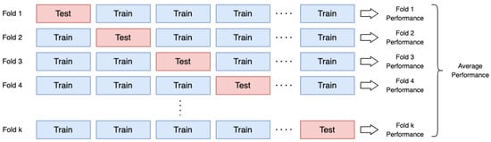 Cross-validation includes K-fold cross-validation, leave-one-out cross-validation, stratified cross-validation, time series cross-validation, and group cross-validation [28]. Among these, we opt for the first method. K-fold cross-validation involves dividing the data into k folds (subsets) as illustrated in Figure 7, using each fold as the test data while the rest serve as the training data to evaluate the model. Subsequently, as shown in Equation (6), this process is repeated k times to calculate the average performance of the model. Other methods are typically used for time series data, class imbalance, or grouped data. Since our conditions do not align with these criteria, we choose K-fold cross-validation.