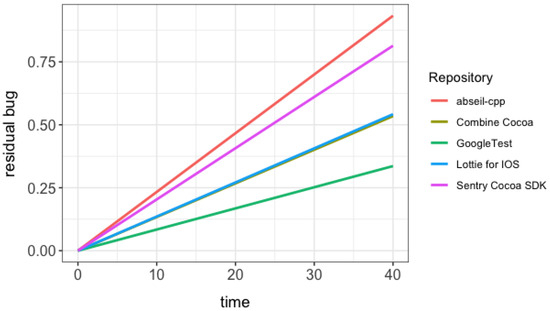 Equation (5) calculates the rate of change of each piece of data over time, where x represents the date x when the issue was created or closed, and y represents the number of residual bugs. Based on the calculated trends, we can quantify the progress of bug-fixing activities in OSS in the future.