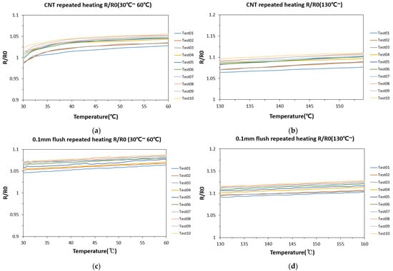 Resistance variation of CNT web film by flush and temperature range: (a) 0 flush at 30 °C 60 °C, (b) 0 mm flush at 130 °C , (c) 0.1 flush at 30 °C 60 °C, (d) 0.1 flush at 130 °C , (e) 0.3 flush at 30 °C 60 °C, (f) 0.3 mm flush at 130 °C .