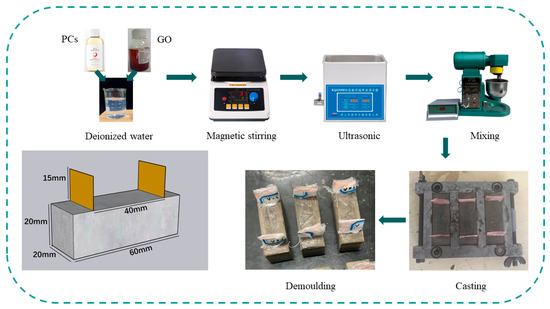 Five GO concentrations of 0%, 0.025%, 0.05%, 0.075%, and 0.1% were prepared to further refine the GO concentration in the previous study [32,33]. Table 3 shows the preparation ratio, and the preparation process is shown in Figure 1.