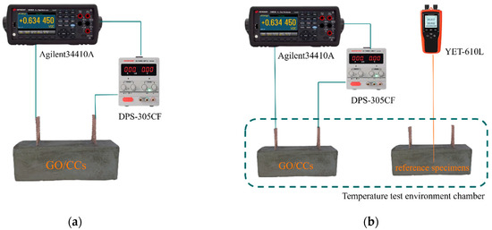 There are, however, many mechanisms of GO/CCs that have not yet been explained. In general, it is believed that the conductive mechanism of GO is electronic, and the presence of ions in cement micropores is also conductive. The two mechanisms operate simultaneously [22]. As cement-based sensors operate in a natural environment, changes in ambient temperature and humidity affect the water content and temperature of the cement material, which has an impact on its electrical conductivity. Therefore, changes in water content can interfere with the sensing signal, which can have an impact on the application of the sensor. Water plays a significant role in the electrical conductivity and polarization effect of CCs [23,24]. In the case of pure cement specimens, the ionic conductivity of water causes polarization when measuring material resistance with a DC power supply. To eliminate the influence of the polarization effect caused by moisture, most researchers choose to dry specimens as much as possible before experiments. However, the dry state is not the final use state of cement. When cement is hydrated, tiny voids form and pore water exists in the pores. The conductivity mechanism and polarization of GO/CCs are not fully understood. Wei et al. consider that polarization effects are not expected in dry samples. Polarization effects only occur if the specimen contains water [25]. Zeng et al. mentioned that few studies have focused on the conductive properties of GO/CCs, and it is necessary to further investigate the mechanism of their electrical conductivity properties [26]. In addition, Chung et al. suggest that, from another perspective, polarization phenomena can be used as information to characterize the properties of cement composites. Polarization-based sensing (sensing based on the change in polarization due to a stimulus) is distinguished from widely studied resistance-based sensing (sensing based on the change in resistance due to a stimulus) [22]. For these reasons, it is necessary to investigate the electrical conductivity, DC polarization effect, and the mechanism of electrical conductivity of GO/CCs, and to explore the electrical conductivity of GO/CCs under the influence of multiple environmental factors [27,28,29]. In addition to water content, temperature is also a significant factor affecting the electrical conductivity of CCs [22,30]. Due to the temperature gradient between the surface and the interior of the cement, previous studies investigating the effect of temperature generally employed the method of leaving the specimen in the environment for a period of time before determining its electrical conductivity [27]. However, this method does not reflect the effect of changing ambient temperatures on the material’s conductivity intuitively [31].