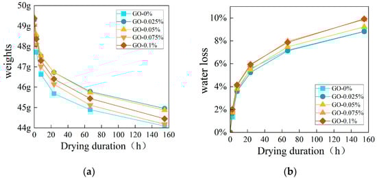 (a) Specimen weight variation with drying time; (b) variation in water loss with drying time.