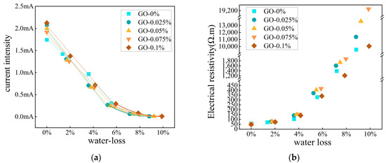 Figure 4a shows the relationship between the average current intensity of the specimens and the water loss for different GO concentrations in GO/CCs. For WL ≤ 6%, the current intensity decreased linearly with the increase in WL, and the data of resistivity variation with WL for five specimens, 0%, 0.025%, 0.05%, 0.075%, and 0.1%, were fitted linearly; the results are shown as a straight line in Figure 4a. The R2 values were 0.98633, 0.98542, 0.98863, 0.99341, and 0.99151, respectively. When WL ≥ 6%, the decrease in the current intensity became slower and showed a tendency to form an arc. Figure 4b shows the change in volume resistivity of GO/CCs with water loss. When GO/CCs are saturated with water, the volume resistivity is about 50 Ω·m. With the loss of water, the resistivity rises stepwise to about 70, 150, and 400 Ω·m. After a WL of more than 6%, the variability increases dramatically, with the resistivity rising to 1200 Ω·m. After a WL of more than 8%, the resistivity increases to 10,000 Ω·m. Therefore, the volume resistivity of GO/CCs changes the most when the WL exceeds 8%. Therefore, the WL greatly influences the electrical conductivity of GO/CCs, and the increase in electrical conductivity of specimens with different GO concentrations is slightly different. In contrast to the change in GO concentration, water loss has a greater effect on electrical conductivity. According to Yoo et al., the addition of GO (0.05%) reduces the electrical resistivity of the cement, and the conduction mechanism in the cement changes from ionic conduction to combined ionic and electronic conduction [6]. The microstructure of the cement specimen contains numerous microscopic pores, allowing for a higher retention of pore water. In a water-saturated state, ions dissolved in this pore water can conduct between these pores, leading to ionic conductivity. Moisture is a carrier of ionic conductivity, and with increasing WL, the moisture connected in the microscopic pores gradually decreases and ion migration becomes more difficult. Thus, the ionic conductivity in the material decreases linearly with decreasing moisture content [17]. Figure 4 illustrates that the electrical conductivity of GO/CCs at higher moisture content levels is mainly determined by the ionic conductivity in the pore water. Compared with the specimens with 0% GO concentration, the decreasing trend of current intensity of the specimens with 0.025–0.1% GO concentrations demonstrated similar results, thus indicating that ionic conductivity is a dominant factor in the electrical conductivity of GO/CCs.
