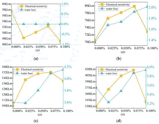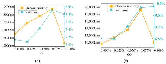 Expanding on the results presented in the previous section, the electrical resistivity of GO/CCs is positively correlated with WL, but the electrical conductivity is still affected by GO concentration when the specimen WL is the same. Figure 5 demonstrates the WL of specimens with different GO-doping concentrations after different drying times and the resulting resistivity values. In Figure 5a, the specimen is in a water-saturated state and thus the specimen’s electrical conductivity is largely governed by ionic conductivity, while the electronic conductivity caused by the increased GO concentration of GO is hardly significant. Therefore, the resistivity of the specimen shown in the figure does not correlate with the GO concentration. As shown in Figure 5b–f, with an increase in GO concentration, the resistivity of the specimen increases first and is followed by a decrease. The probable reason is that the higher GO concentration specimens had higher WL for the same drying time. The addition of 0.025%, 0.05%, and 0.075% GO concentrations reduced resistivity, but this effect failed to counteract the increase in resistivity due to water loss; therefore, the conductivity results showed a decrease with increasing GO concentration. However, the resistivity of the 0.1% GO concentration specimens showed completely different results at different stages. Although more water was lost at 0.1% GO than at 0%, 0.025%, 0.05%, and 0.075% concentrations (the WL of 0.1% was almost the same as the WL of 0.075%), the resistivity of the 0.1% GO concentration specimen was substantially lower. A possible reason is the percolation threshold effect of CCs [17]. It is considered that a 0.1% GO concentration in GO/CCs reaches the percolation threshold in the cement matrix, forming a complete conductive network with a substantial decrease in electrical resistivity. Therefore, the addition of GO at 0.1% concentration significantly reduced the electrical resistivity of GO/CCs, and GO may have reached the percolation threshold at 0.1% GO concentration.