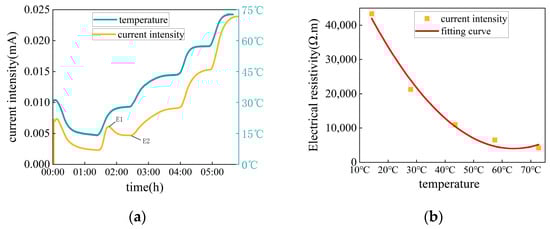 The GO/CC specimens with WL of 11.09% and 0.05% of GO concentration were subjected to temperature sensitivity tests. In Figure 6a, it can be seen that the trend for the current intensity of GO/CCs is basically the same as the temperature trend. The difference is that when the temperature of the specimens was increased from 10 °C to 25 °C and then stabilized, the current intensity of the specimens changed from an increase to a sudden decrease. This phenomenon was observed in all three parallel specimen tests, but not in the other heating intervals. The value of the current intensity drop, Id = IE1 − IE2, is about 0.001408 mA. It may be that polarization causes this drop. When the ambient temperature stabilizes, the current intensity of the specimen also stabilizes. When the temperature of carbon nanomaterials increases, the tunneling effect is strengthened and more GO conductive networks are formed, thus increasing the electrical conductivity [27].