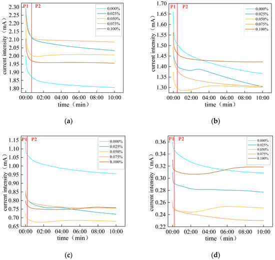At the I, II, III, and IV drying states, as shown in Figure 7, the current curves of the specimens without added GO still showed a large downward trend after ten minutes of energization. This phenomenon may be related to the high moisture content of the specimens, contributed to by the connection of water in the microscopic pores. Ions are constantly migrating towards the poles. Charges in the form of ions cannot enter the electronic conductor via conduction, and so they collect at both ends of the conductor connection: positive ions at one end, and negative ions at the other. Opposite electric fields are formed relative to the power source [22]. Therefore, the current intensity of the specimen decreases over an extended period of time. The gradual enhancement in the opposite electric field causes the decreasing trend to change from fast to slow, such as in the P1 and P2 stages. For the specimen with 0.025% GO concentration, due to the lower GO concentration, the decreasing amplitude in the I, II, III, IV, and V drying states is almost the same as that of the blank group; the current rebound phenomenon occurs only in the II and III drying states. This is because the conductivity of the specimen is still dominated by ionic conductivity, and the electronic conductivity of GO fails to have a large impact. Compared with the specimens with 0% and 0.025% GO concentrations, the current trend of the specimens with 0.05%, 0.075%, and 0.1% GO concentrations was obviously stabilized after a period of energization. Not only did the decreasing trend slow down significantly, but the current rebound phenomenon was observed at different drying states. Therefore, it is concluded that the addition of GO can attenuate the polarization, slow down the decreasing trend of the current, and lead to a rebound of the current.