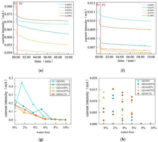 The current rebound phenomenon was analyzed for different specimens. The rebound phenomenon is affected by both GO concentration and WL. Figure 7h demonstrates the current intensity uplift values of the rebound phenomenon at different drying states for different GO concentrations. It is shown that the current intensity rebound phenomenon was not observed for specimens with 0% GO concentration drying states. It can be assumed that the addition of GO led to this phenomenon. It was found that the current rebound phenomenon did not occur in almost all specimens at WL ≥ 8%; this may be due to the weak ionic conductivity of the specimens at high water loss rates. The occurrence of the rebound phenomenon is considered to be related to ionic conductivity and GO addition. As shown in Figure 7f, at drying state VI, the phenomenon of spike fluctuations in the current intensity curves of the specimens was observed; therefore, further investigation was carried out for each GO concentration specimen at drying state VI.