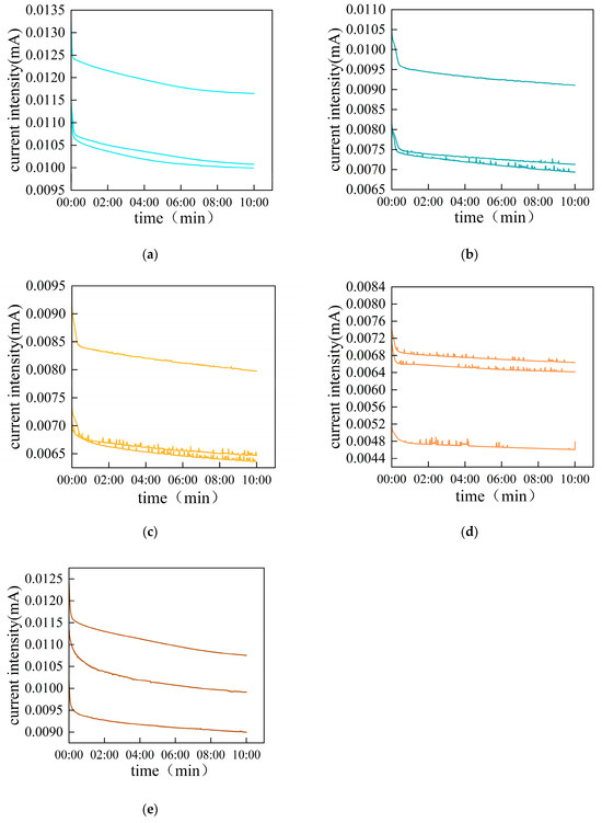 Current curve spike fluctuation phenomenon of GO/CCs in low water content state. Current curves of different GO concentration specimens: (a) 0% GO concentration; (b) 0.025% GO concentration; (c) 0.05% GO concentration; (d) 0.075% GO concentration; and (e) 0.1% GO concentration.