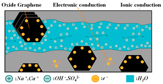 Ya Wei et al. argued that water forms an energy barrier in the moving direction of the carrier [36]. This solid–liquid interface constitutes an energy barrier in the direction of the movement of the carrier [25]. According to Mao et al., when the bare ion is near and above the molecule sheet, it can capture electrons from the graphene fragment via polarization interaction [37]. The more probable cause is that the ions in the water are preventing electron migration. Since ionic conductivity coexists with electronic conductivity, ions migrating in water may prevent electron movement between two neighboring GO particles. Thus, two GO particles are not able to generate a tunneling effect, disrupting a part of the electron-conducting network. The GO particles on the upper left were unable to migrate electrons with the GO particles on the lower left as a result of ion migration in water, as shown in Figure 9. Due to this, the addition of GO to specimens with a high water content has a less significant effect on electrical conductivity, and electrical conductivity is dominated by ionic conductivity, which decreases with increasing WL.