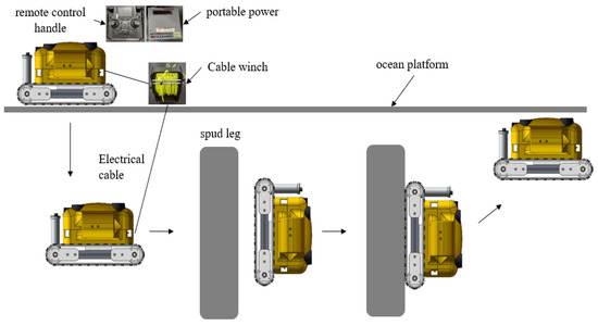 Considering actual situations, the diameter of the jacket of an offshore platform is generally relatively large. Due to the small size of the amphibious robot designed, the robot can be regarded as having a curved surface with an infinite diameter, that is, the robot action scene is regarded as a plane. However, due to the limitations of the conditions, the simulation experiment for the robot’s function was carried out in a pool. However, such experiments can still normally reflect the practicality of amphibious robot functions.