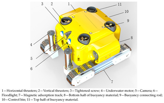 The portable magnetic adsorption amphibious robot was independently developed in the laboratory. According to the idea of modular parameterization, the robot studied can be divided into a buoyancy mechanism module, a thruster power module, a vision system module, a magnetic adsorption track module, and a control module. The buoyancy mechanism module is made of glass microbead materials, which mainly provide buoyancy for the robot under water. As the power source of the robot’s underwater movement, the propeller power module is used to control the robot’s underwater movement. The function of the vision system module is to observe and locate the target, and two lights are installed on both sides of the module, so that the camera can obtain higher clarity when working in a dark environment [14]. The adsorption unit of the magnetic adsorption track module is fitted with a strong permanent magnet to ensure that the robot is stably adsorbed on the metal wall. The control module is the core module of the robot, and its main role is to provide control signals and power transmission for each component [15].