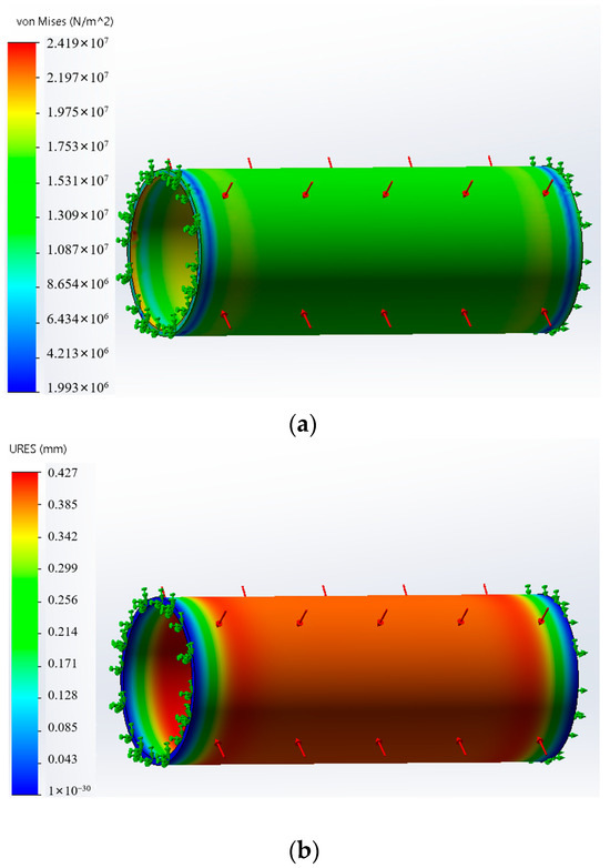 In order to ensure the safe operation of the control cabin underwater, a static simulation of the cabin body was analyzed. The applied pressure was 1.5 MPa [17]. Since the two ends of the hatch body are supported by the hatch cover, it was only necessary to impose fixed constraints on the two ends of the hatch body. A cloud diagram of cabin stress and deformation is shown in Figure 6. The maximum deformation area of the cabin body is in the middle part, and the minimum safety factor is greater than 1.5, so the requirements for underwater operation of the robot are met. That is, when the robot is 100 m underwater, the control cabin will not be damaged due to underwater pressure, and the control cabin body will meet the strength requirements.