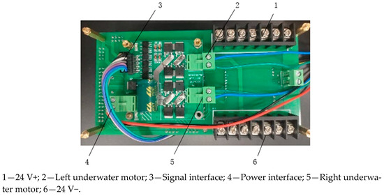 The motor drive board is used to realize the precise control of the motor, which is connected to the IO port of the control board through the signal interface; the power interface is connected to the 24 VDC power supply; and the motor interface is connected to the positive and negative poles of the gear motor. By adjusting the parameters of the PWM pulse waveform, the precise control of motor speed and steering is realized. This process not only simplifies the complexity of motor control, but also improves the stability and reliability of the system. The drive board is provided with two motor interfaces, which are respectively connected to the two underwater motors on the left and right of the track. The signal interface is connected to the control motherboard to receive signal instructions from the control motherboard. Its power interface shares a power line with the control board. A physical picture of the driving board is shown in Figure 9.