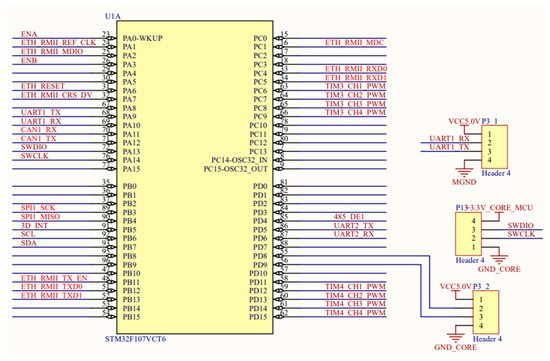 The robot master module uses the STM32F103VCT6 microcontroller, a high-performance ARM Cortex-M3 core operating at 72 MHz, high-speed embedded memory, up to 512 KB of internal flash memory, and up to 64 KB of SRAM, and it is equipped with a variety of peripheral resources, such as a IIC interface, a CAN bus, an SPI interface, a timer, a PWM timer, a 12-bit ADC, an enhanced IO port, etc. Its powerful performance can not only meet the needs of fast response and response stability in the robot control process, but also has the advantages of low power application development and low cost. A circuit diagram of the main control module is shown in Figure 10.