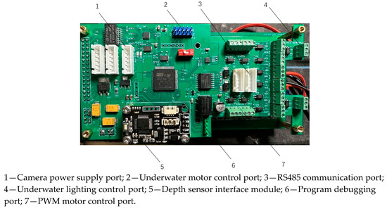 The control motherboard plays an important role in the information interaction and command transmission of the robot in the process of movement. The motherboard integrates the 24 V power supply module for the thruster, the CAN communication module for the thruster, the RS-485 module for the communication between the sensor and the main control chip, and the depth sensor and other interface modules. A physical diagram of the control motherboard is shown in Figure 12.