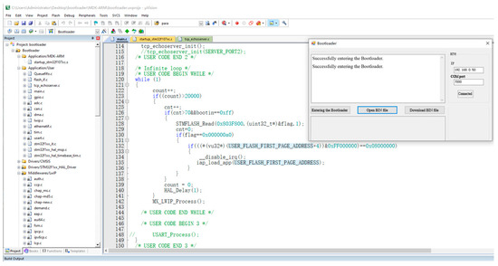 When the control motherboard is installed in the robot control cabin, the electronic bin is repeatedly disassembled to prevent the upgrade of the program in the motherboard, so the bootloader is used to remotely upgrade the robot control motherboard, and the program is downloaded to the chip using the local area network. The bootloader download program interface is shown in Figure 14.
