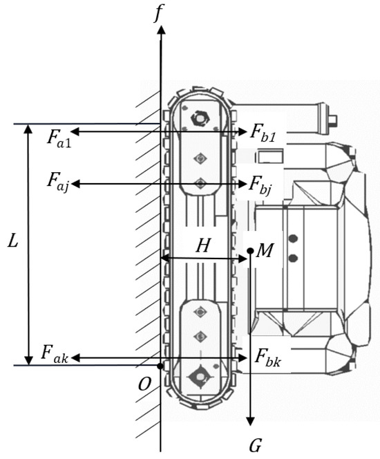 It is assumed that the metal wall is vertical and there is no depression, and each magnetic adsorption unit produces a uniform adsorption force. The mechanical model of the vertical wall of the robot is shown in Figure 16. M is the robot’s center of mass; G is the robot’s weight; H is the distance between the metal wall and the robot’s center of mass; L is the length of the magnetic adsorption unit touching the metal wall; f is the friction force on the unilateral magnetic adsorption track; Fa is the adsorption force generated by the magnetic adsorption unit; k represents the number of unilateral magnetic adsorption tracks adsorbed on the metal wall; Faj represents the adsorption force of the j-th magnetic adsorption unit of the unilateral magnetic adsorption track on the metal wall, where j = (1,2,… k); and Fb is the supporting force of the metal wall on the magnetic adsorption unit.