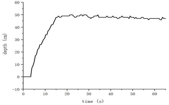 In the depth control experiment, when the robot was suspended in water, the initial depth was 0 m. After waiting for 4 s, the robot was controlled to dive, and the diving depth gradually increased until it reached 0.5 m, and then it stably hovered in the water. The response time of the robot was short and there was no big jitter, and the control effect was good.