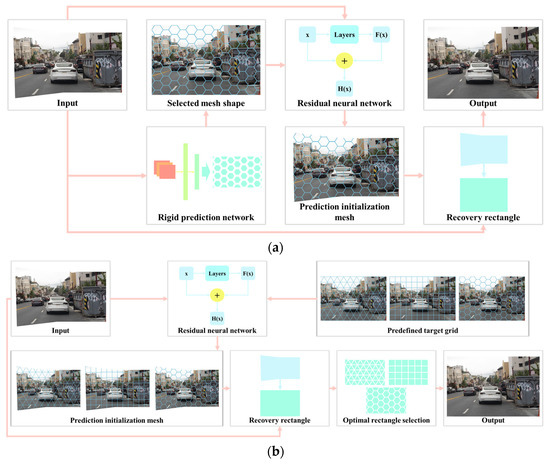 Image rectification with different mesh shape selection modes. (a) Selecting a mesh shape based on the image. Predicting the most suitable mesh shape for an input image through a convolutional neural network. Subsequently, the predicted initial mesh based on this shape and the predefined mesh are jointly input into a residual network for image rectification. (b) Selecting all mesh shapes for loss comparisons. Applying all mesh shapes to the input image and jointly inputting them into a residual network for rectification. The rectified image with the lowest loss is selected as the final output.