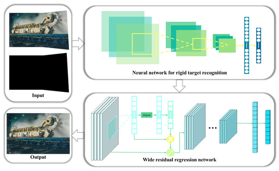 The network architecture proposed in RIS-DMRN consists of two components (Figure 3): the rigid target recognition network and the width residual regression network [41]. The input comprises irregularly stitched images and their stitching mask matrix. The input image is initially processed by a simple recognition convolutional neural network to detect the quantity and orientation of rigid structures. Based on the detection results, the most suitable mesh shape is chosen for rectification. For instance, if there are predominantly horizontal or vertical rigid structures in the image, a preference is given to selecting a rectangular mesh. In the case of a higher prevalence of curved surfaces or curved structures, a triangular mesh is chosen. If the quantities of vertical rigid structures and curved structures are comparable, a hexagonal mesh is selected for image rectification.