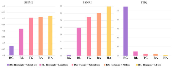 Trends of evaluation indexes under different combinations of loss functions and mesh shapes. The chart displays from left to right, with the vertical axis indicating SSIM, PSNR, and FID values, respectively, while the horizontal axis represents different combinations of mesh shapes and loss functions. Higher SSIM and PSNR values indicate better image rectification effects, and a lower FID value suggests superior image rectification performance. An upward arrow in the table indicates that the larger its value, the higher the image quality, and vice versa.